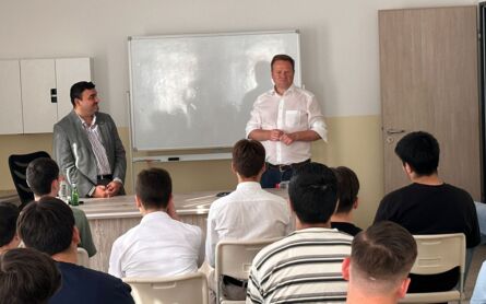 Frank Schwabe im Gespräch mit den Jugendlichen im Schülerwohnheim Recklinghausen